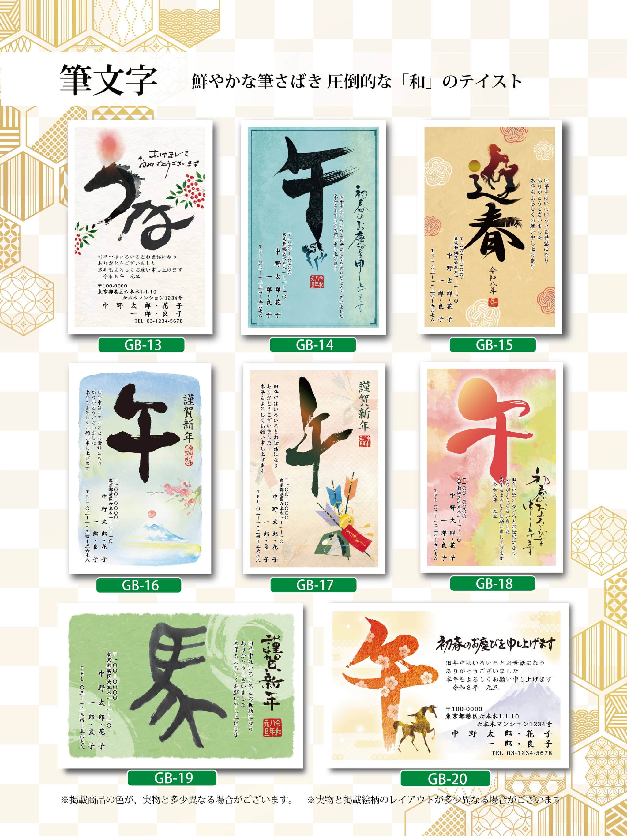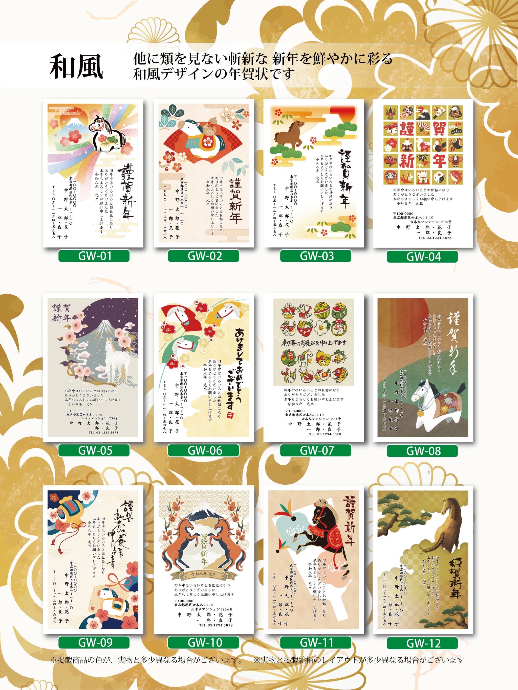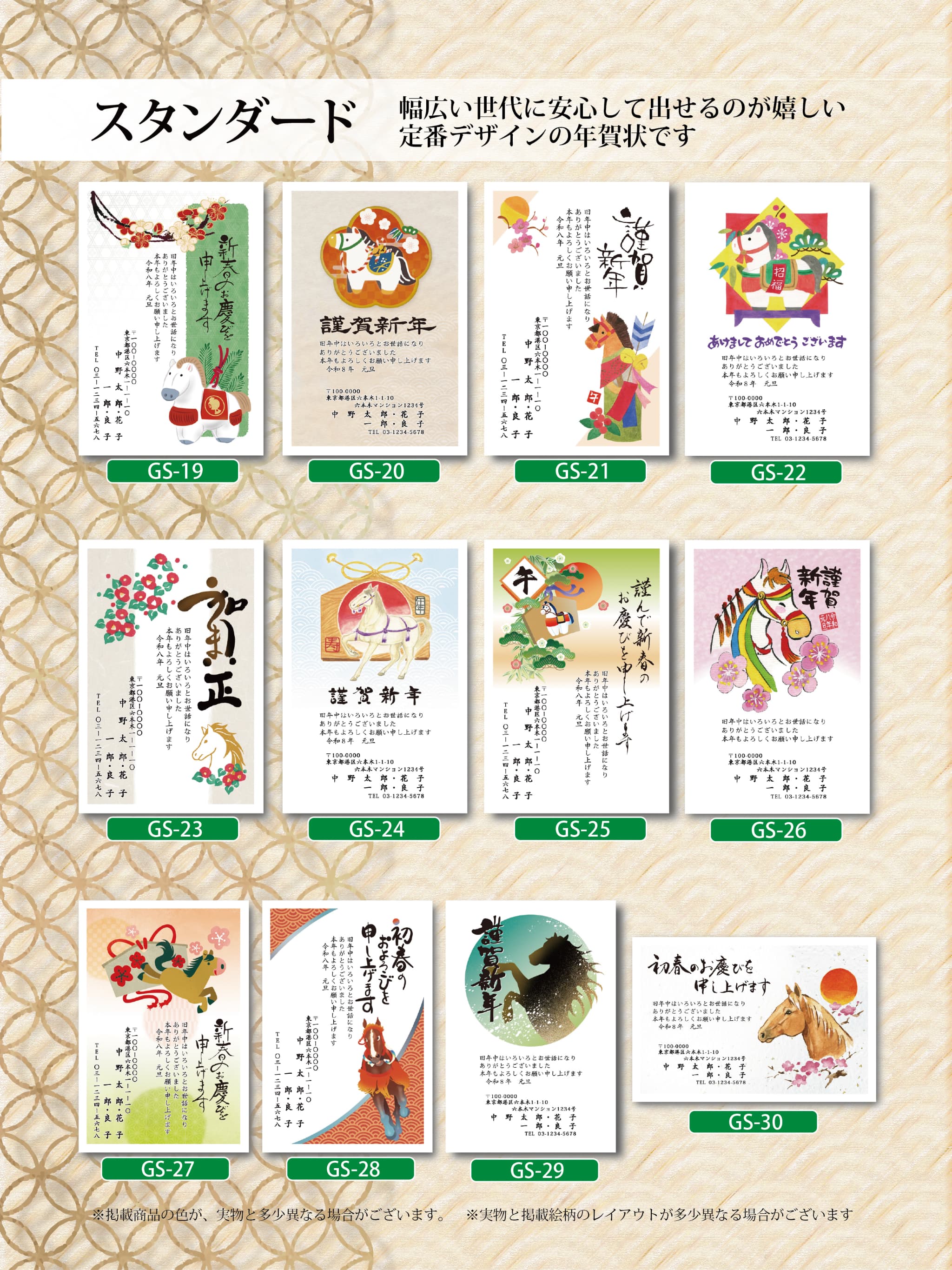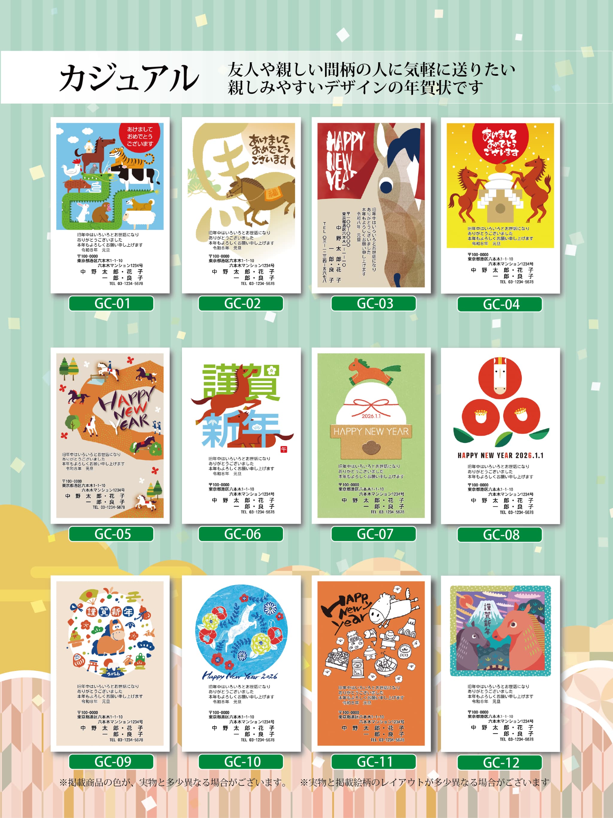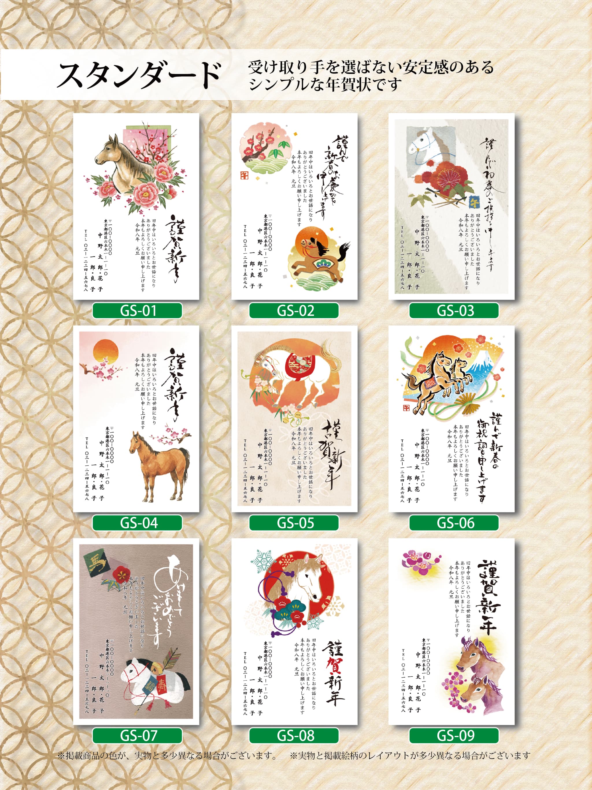 年賀状は一般、結婚、誕生、ビジネス、転居の5つのジャンルから選べ、スタイルもスタンダード、デザイナーズ、縁起物、キュート、和風、絵手紙風、ビジネスなどから選べるので、お気に入りのデザインがすぐに見つかります。その他、喪中、寒中見舞いなど、年賀状以外も厳選したデザインを揃えています。