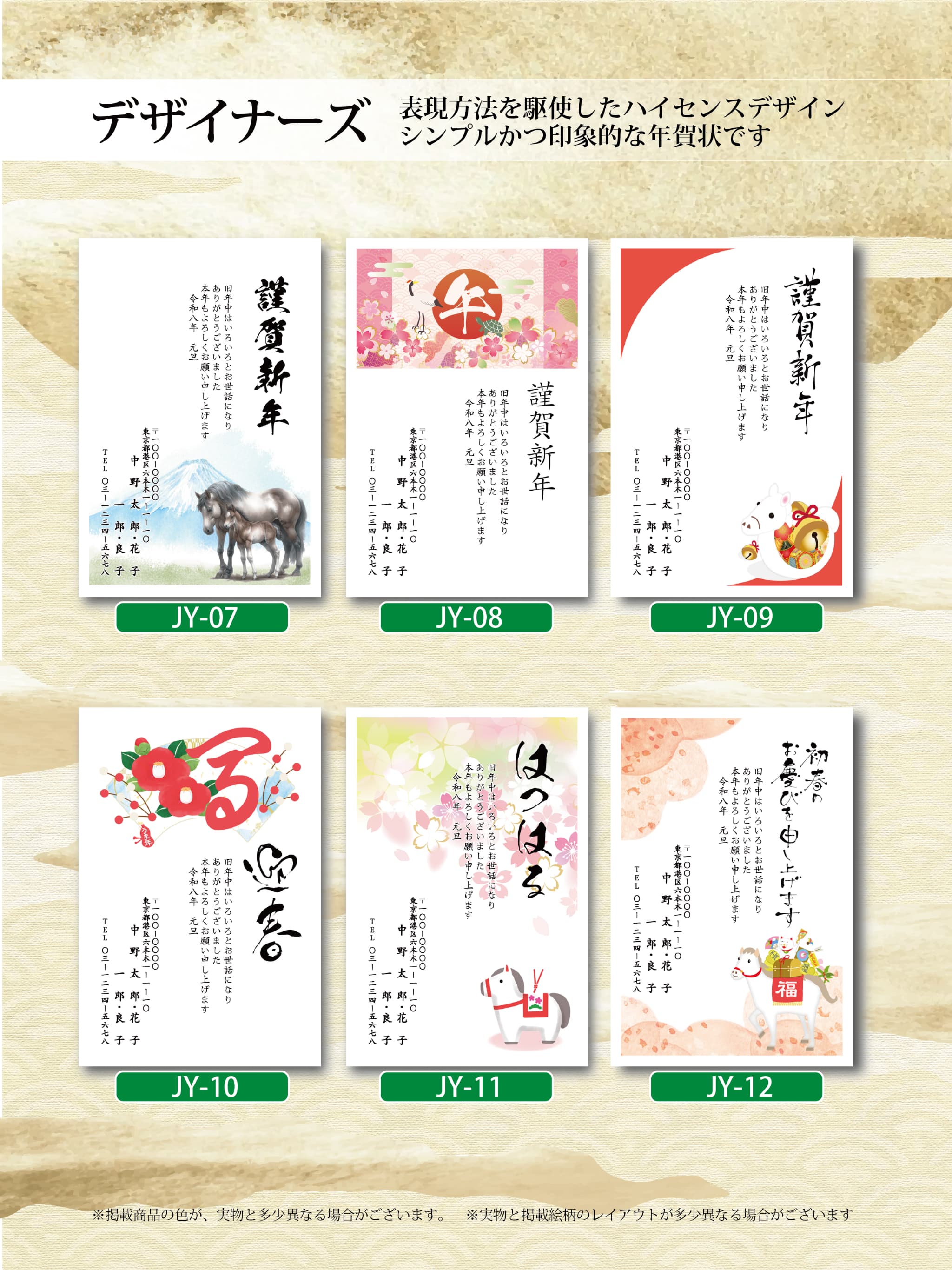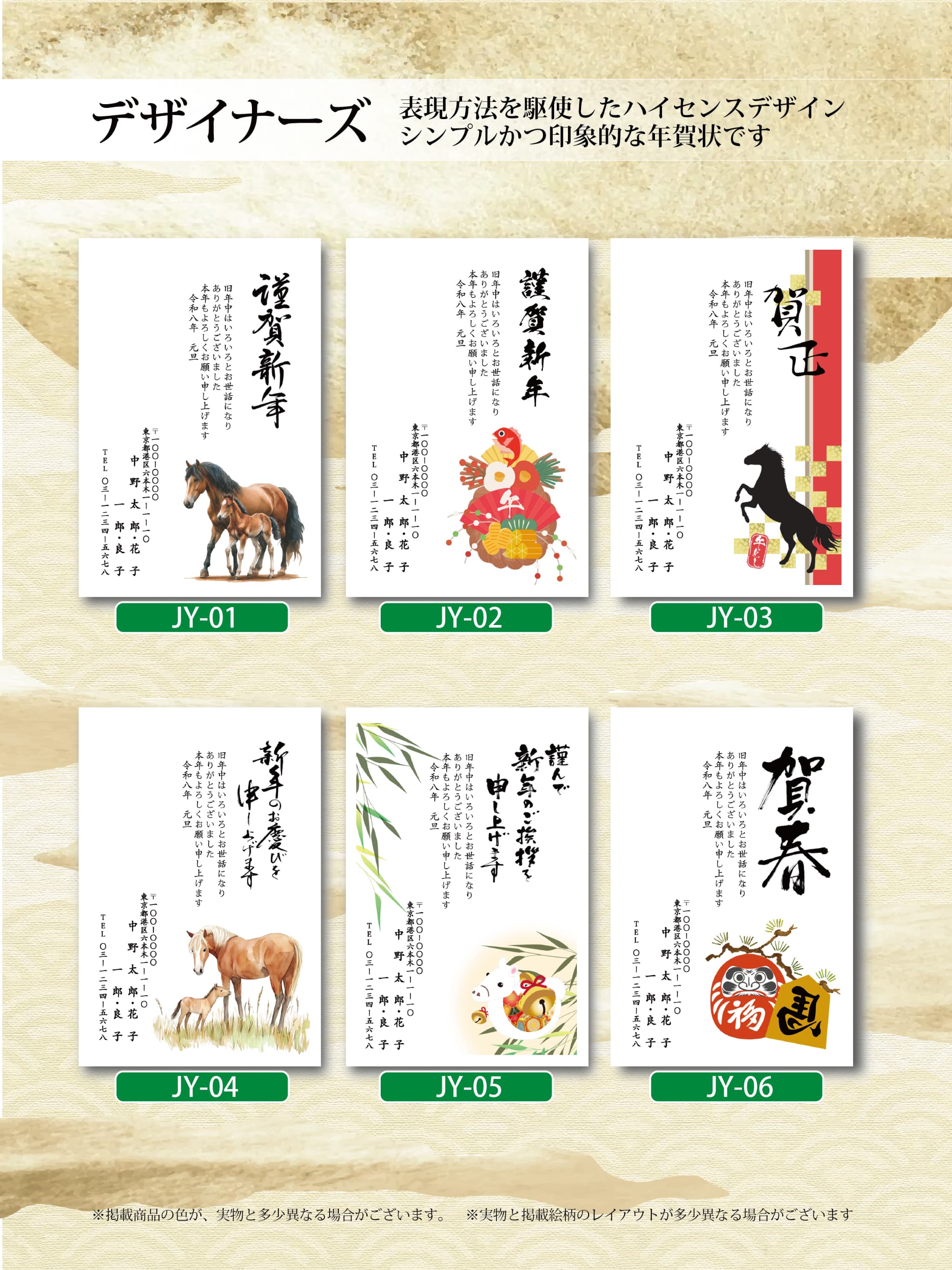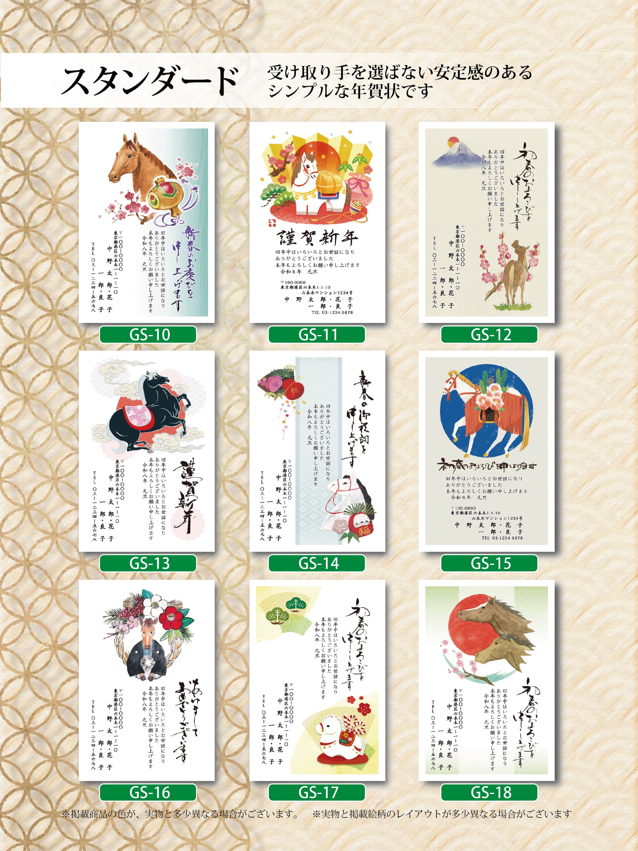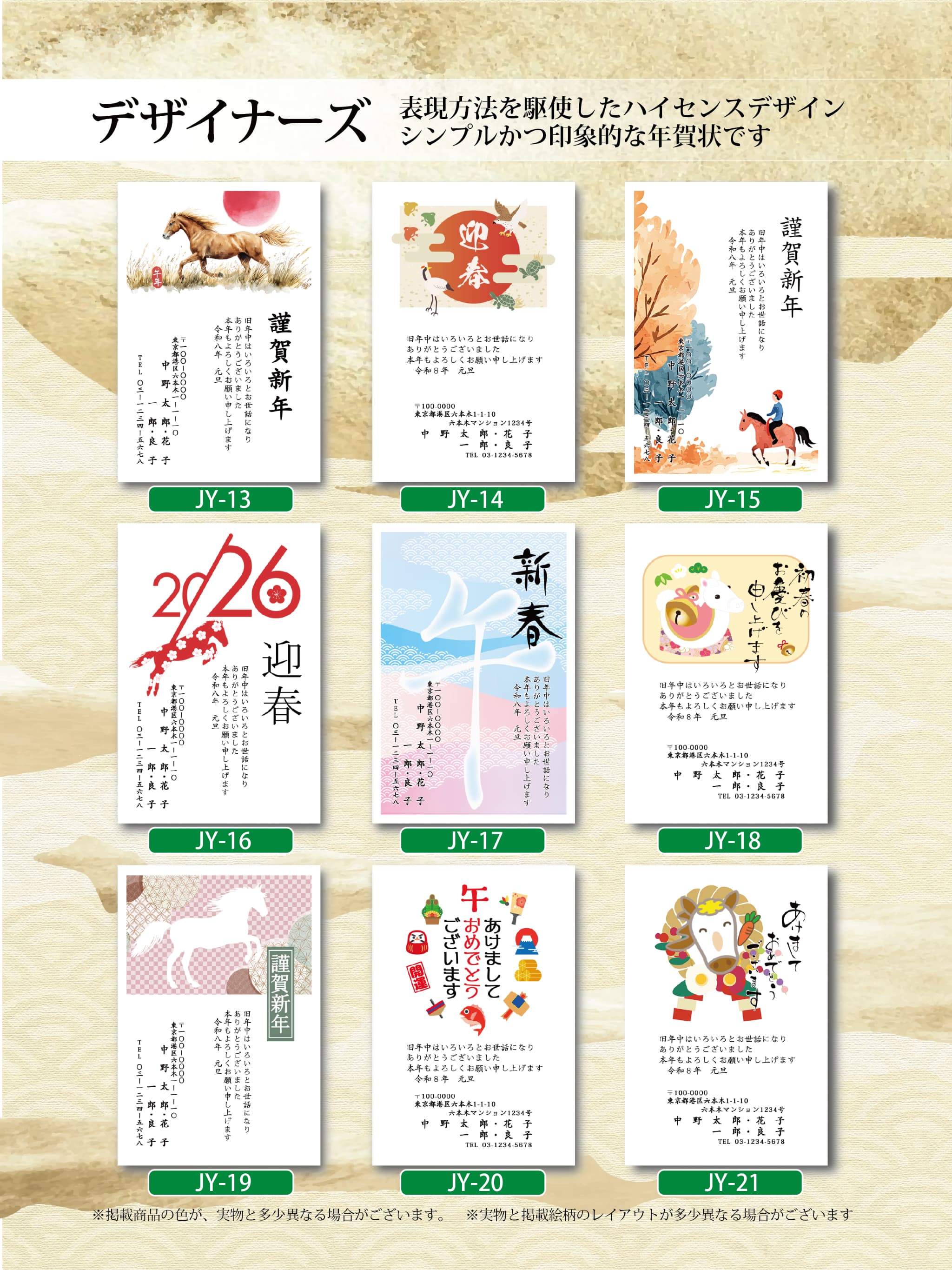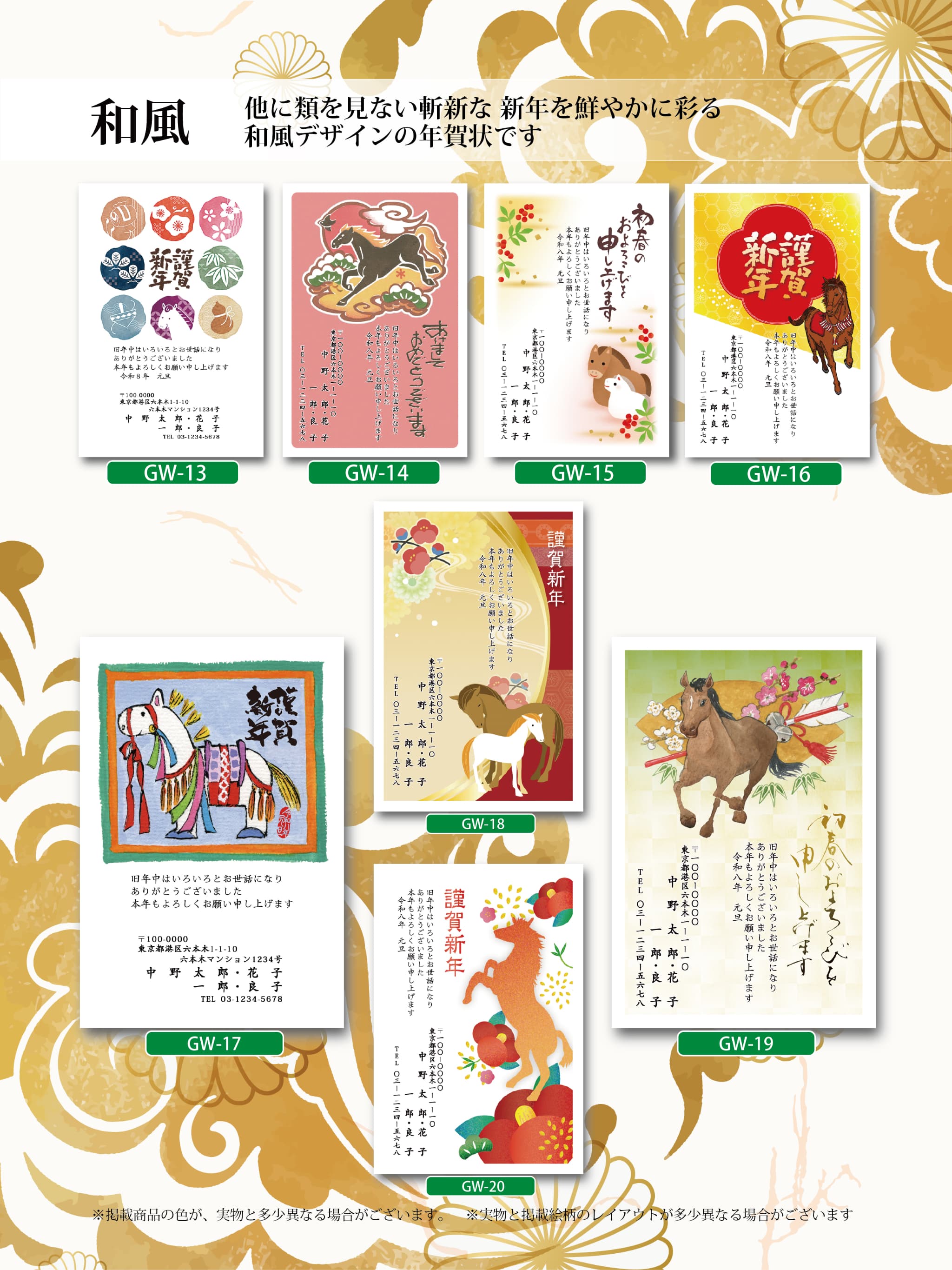 年賀状は一般、結婚、誕生、ビジネス、転居の5つのジャンルから選べ、スタイルもスタンダード、デザイナーズ、縁起物、キュート、和風、絵手紙風、ビジネスなどから選べるので、お気に入りのデザインがすぐに見つかります。その他、喪中、寒中見舞いなど、年賀状以外も厳選したデザインを揃えています。