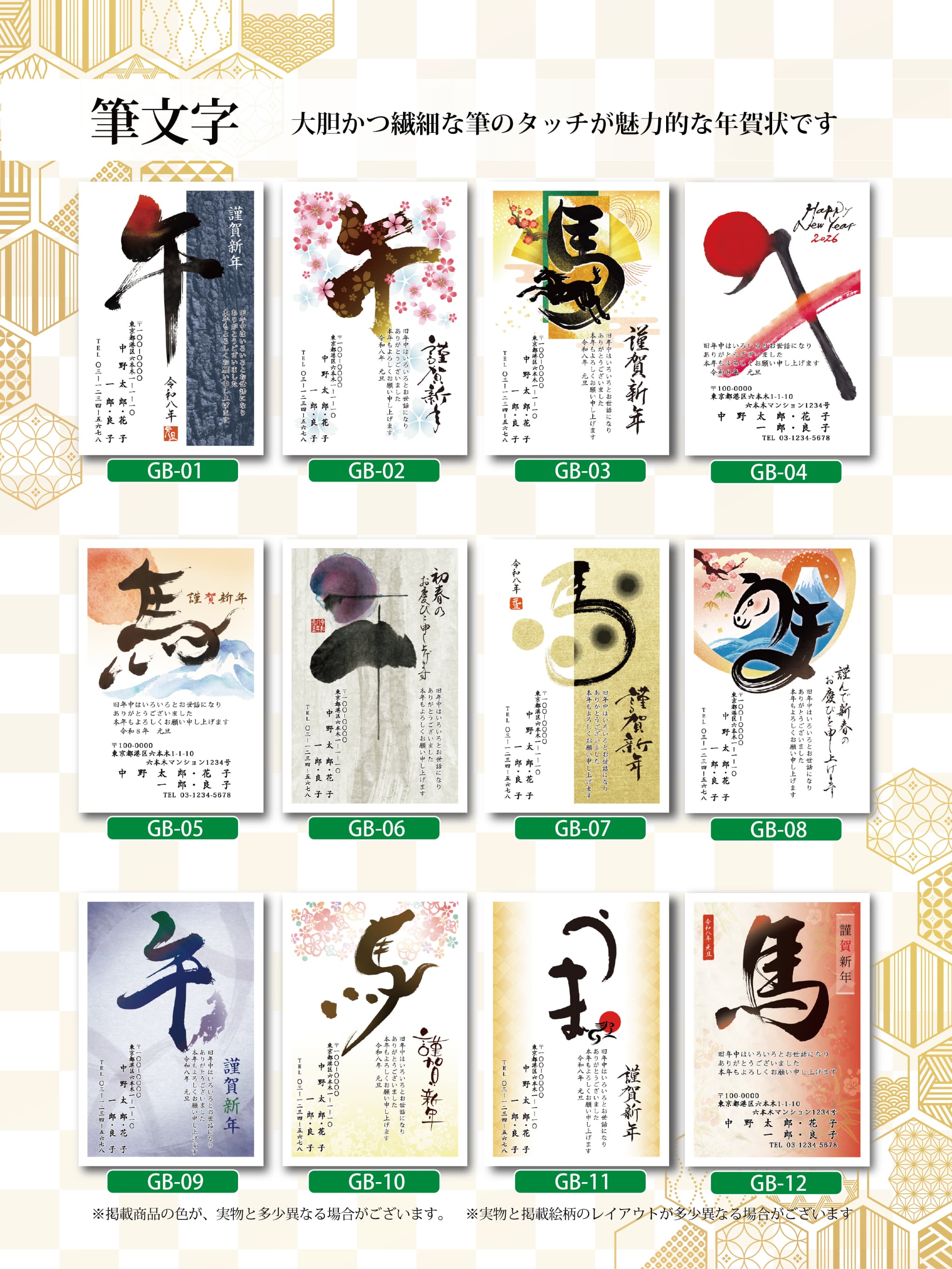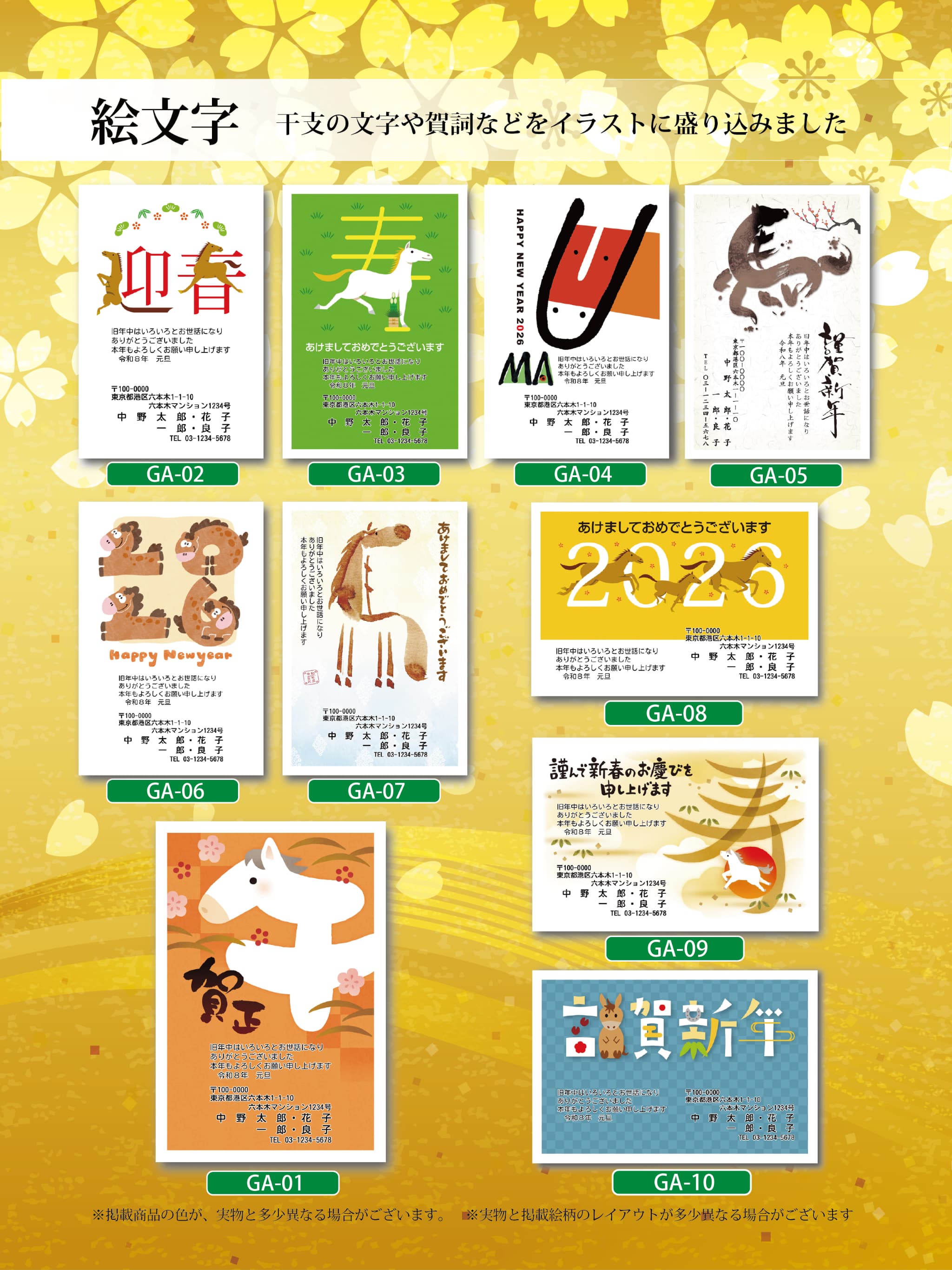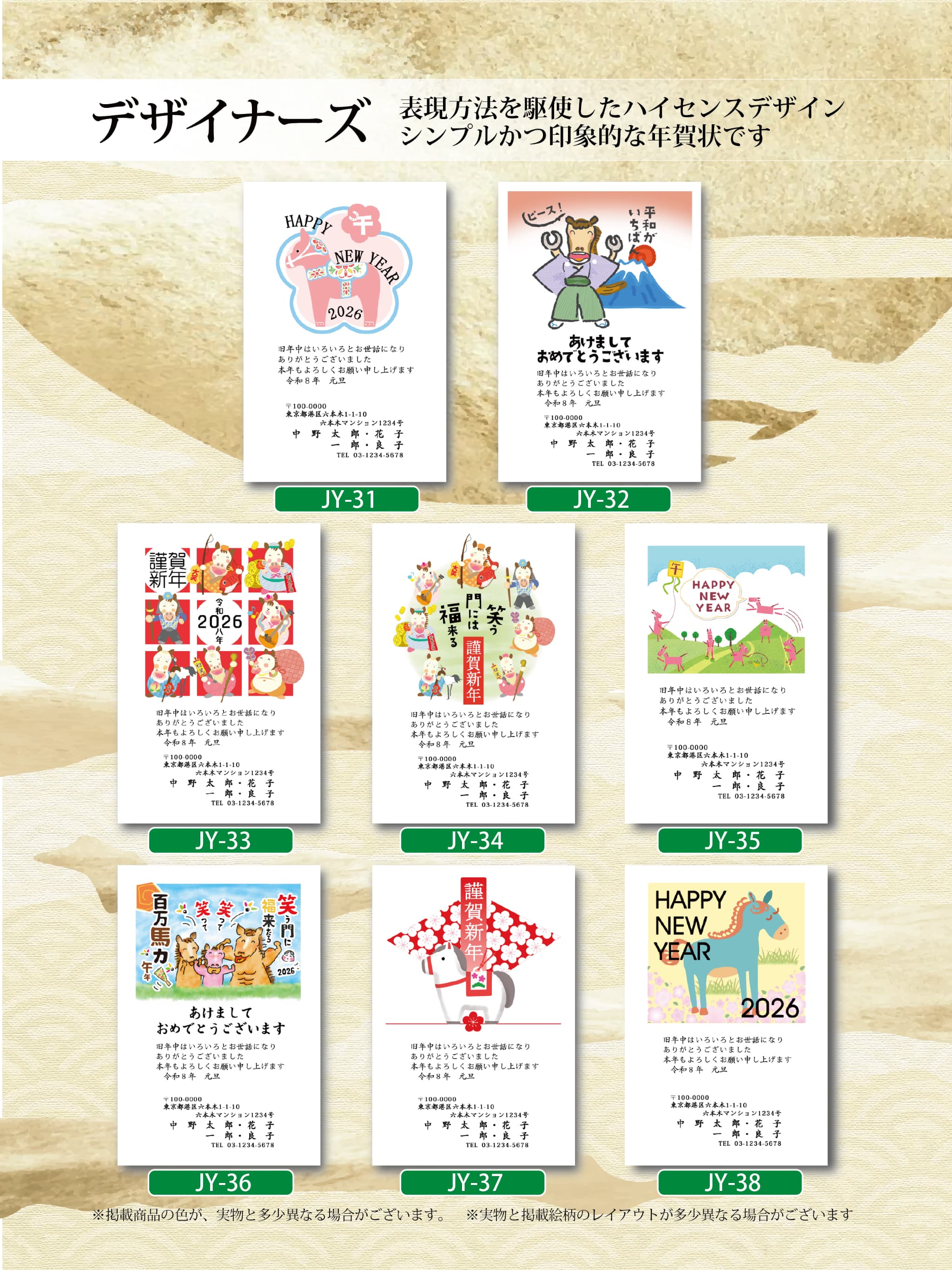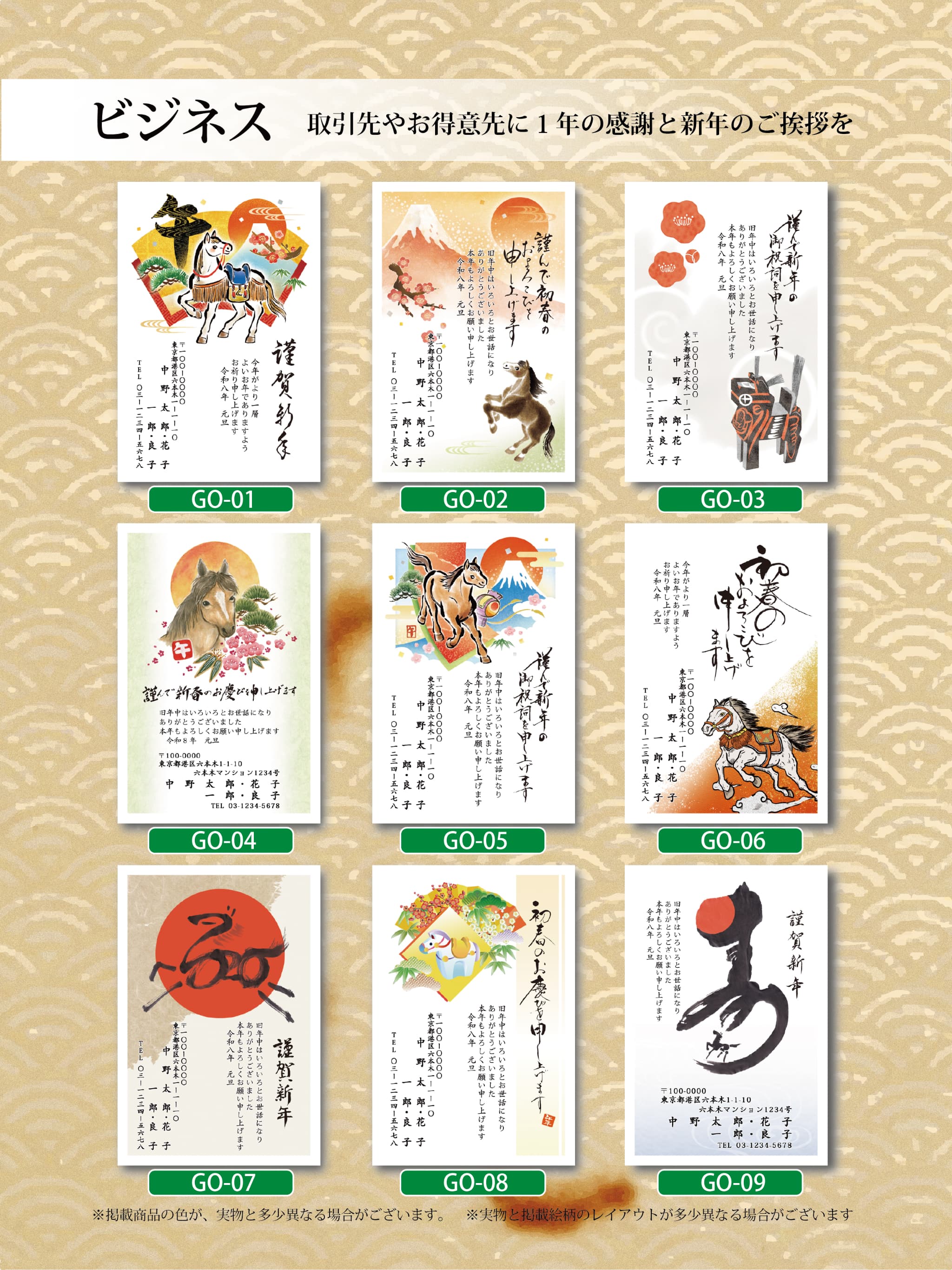年賀状は一般、結婚、誕生、ビジネス、転居の5つのジャンルから選べ、スタイルもスタンダード、デザイナーズ、縁起物、キュート、和風、絵手紙風、ビジネスなどから選べるので、お気に入りのデザインがすぐに見つかります。その他、喪中、寒中見舞いなど、年賀状以外も厳選したデザインを揃えています。