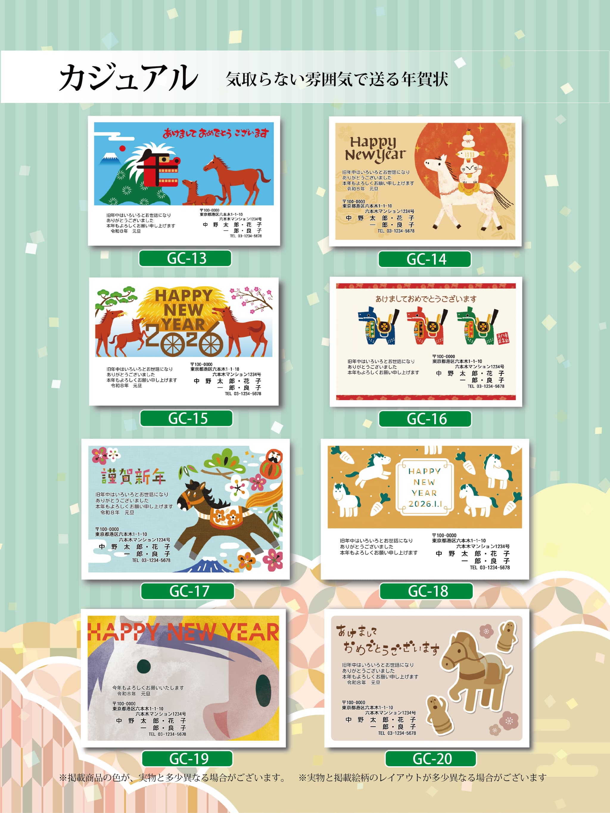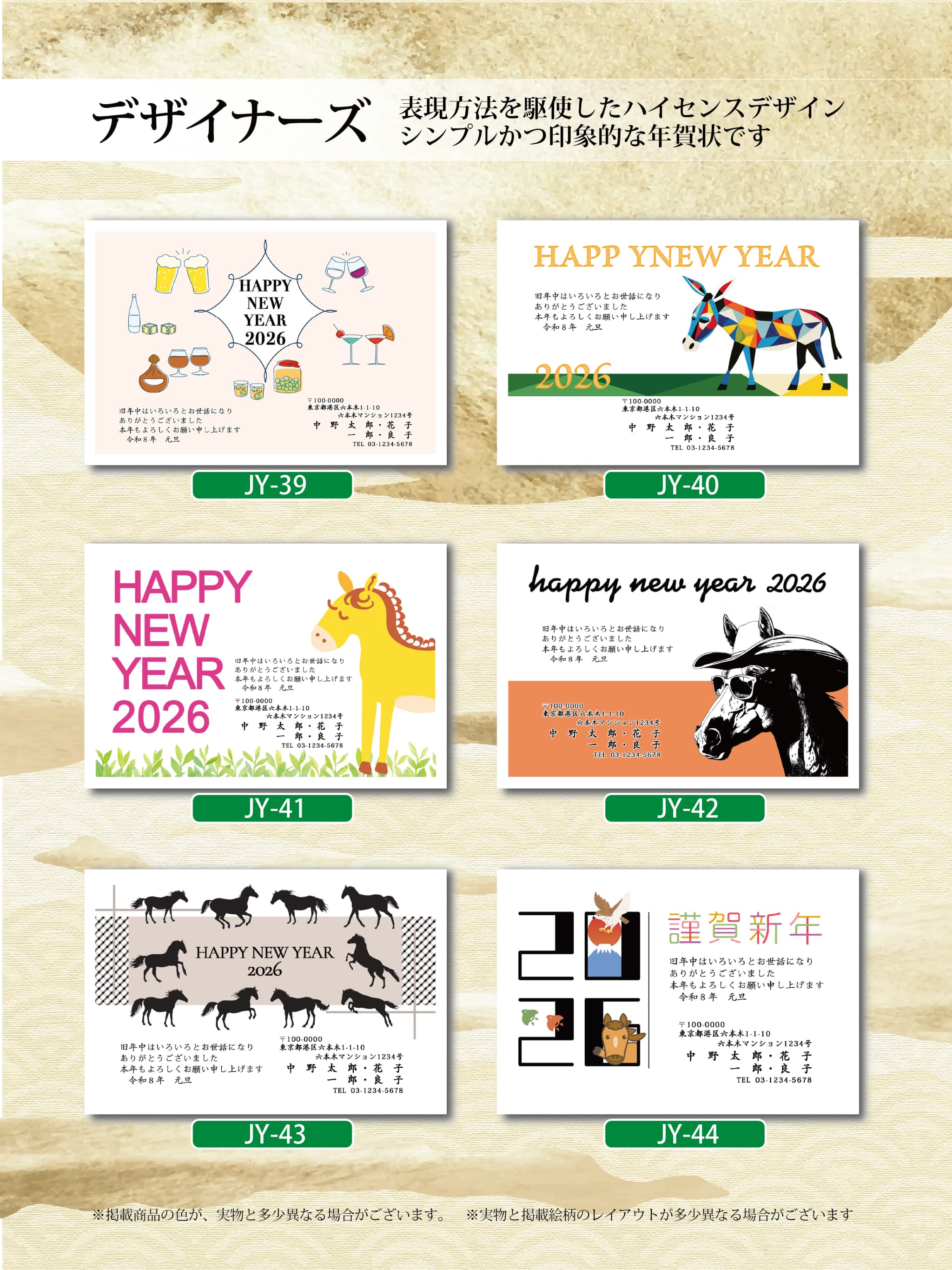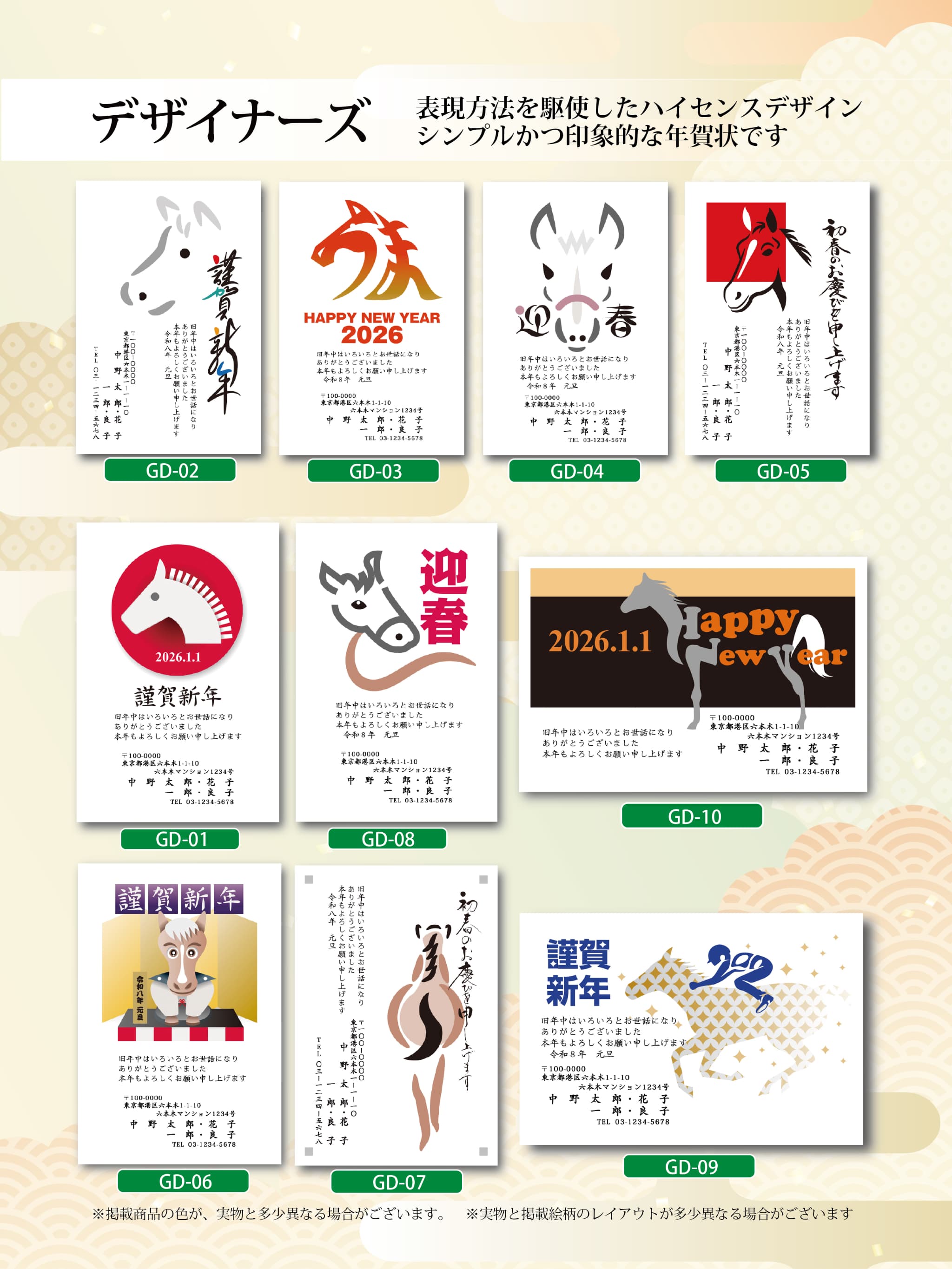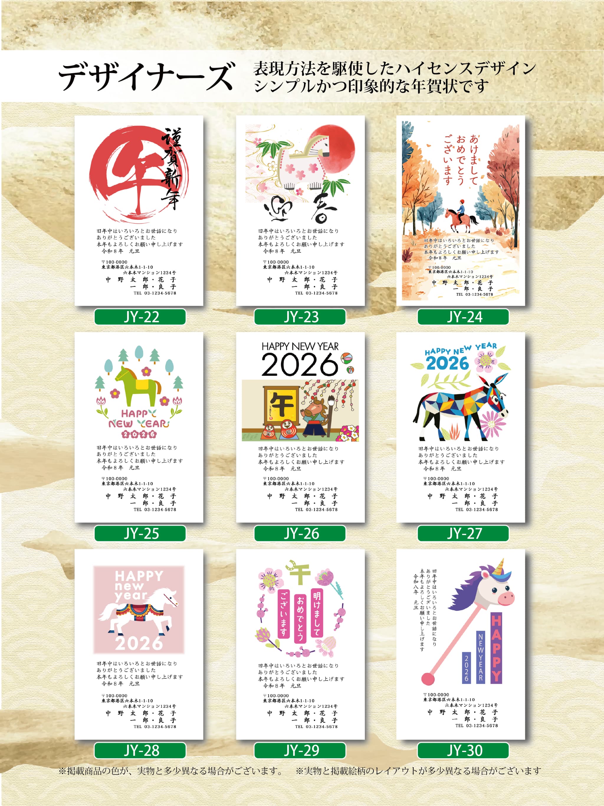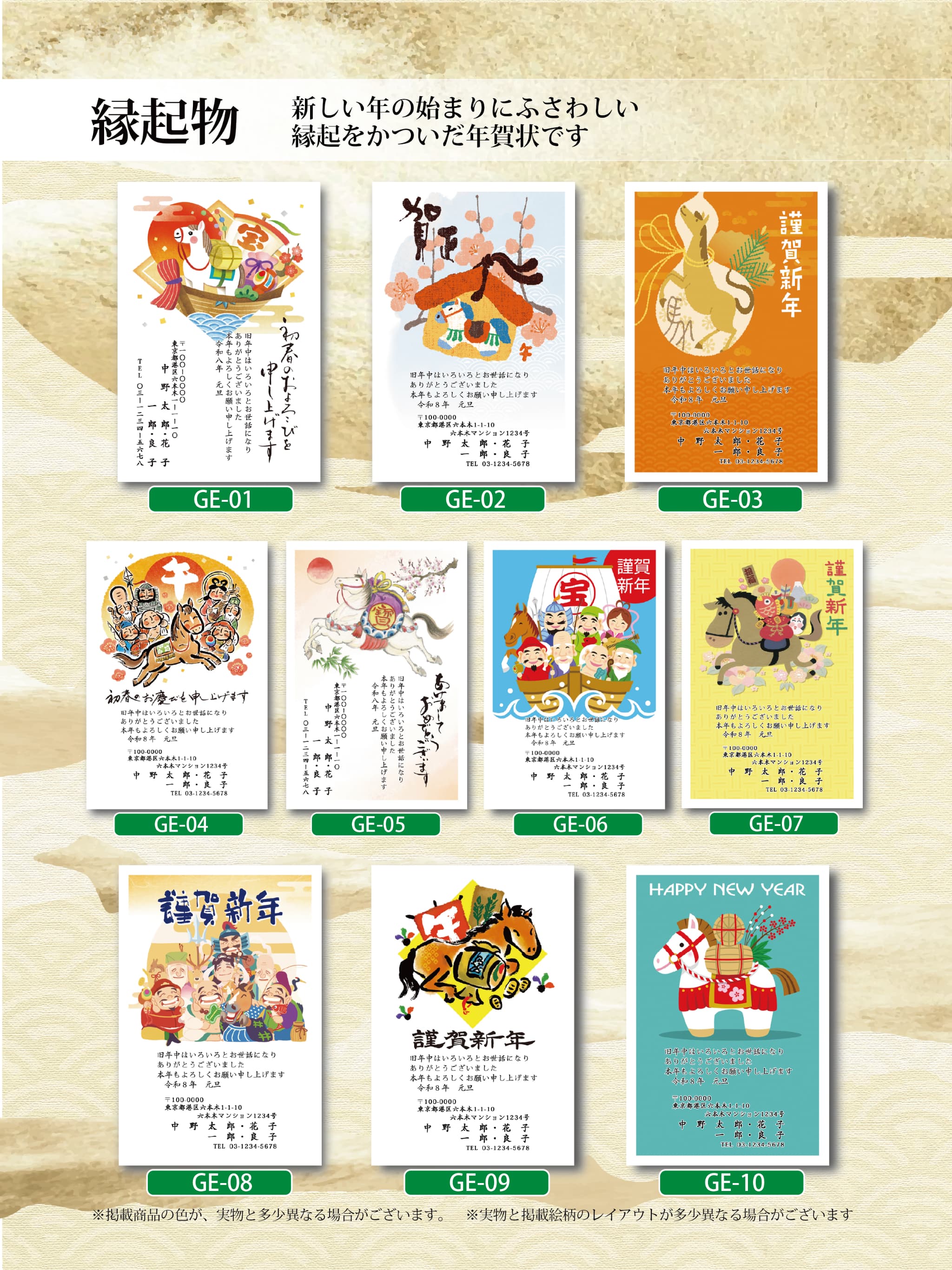 年賀状は一般、結婚、誕生、ビジネス、転居の5つのジャンルから選べ、スタイルもスタンダード、デザイナーズ、縁起物、キュート、和風、絵手紙風、ビジネスなどから選べるので、お気に入りのデザインがすぐに見つかります。その他、喪中、寒中見舞いなど、年賀状以外も厳選したデザインを揃えています。