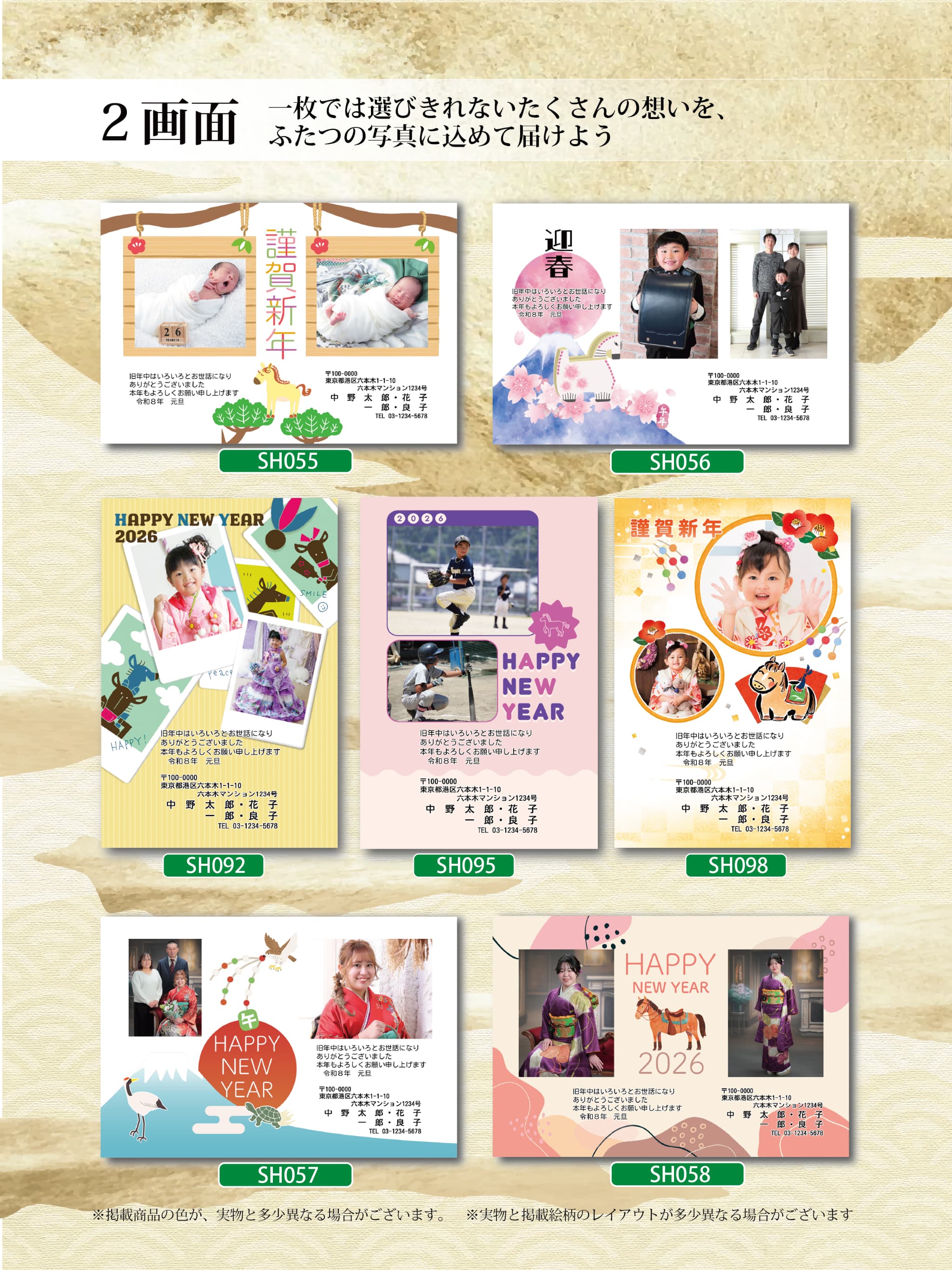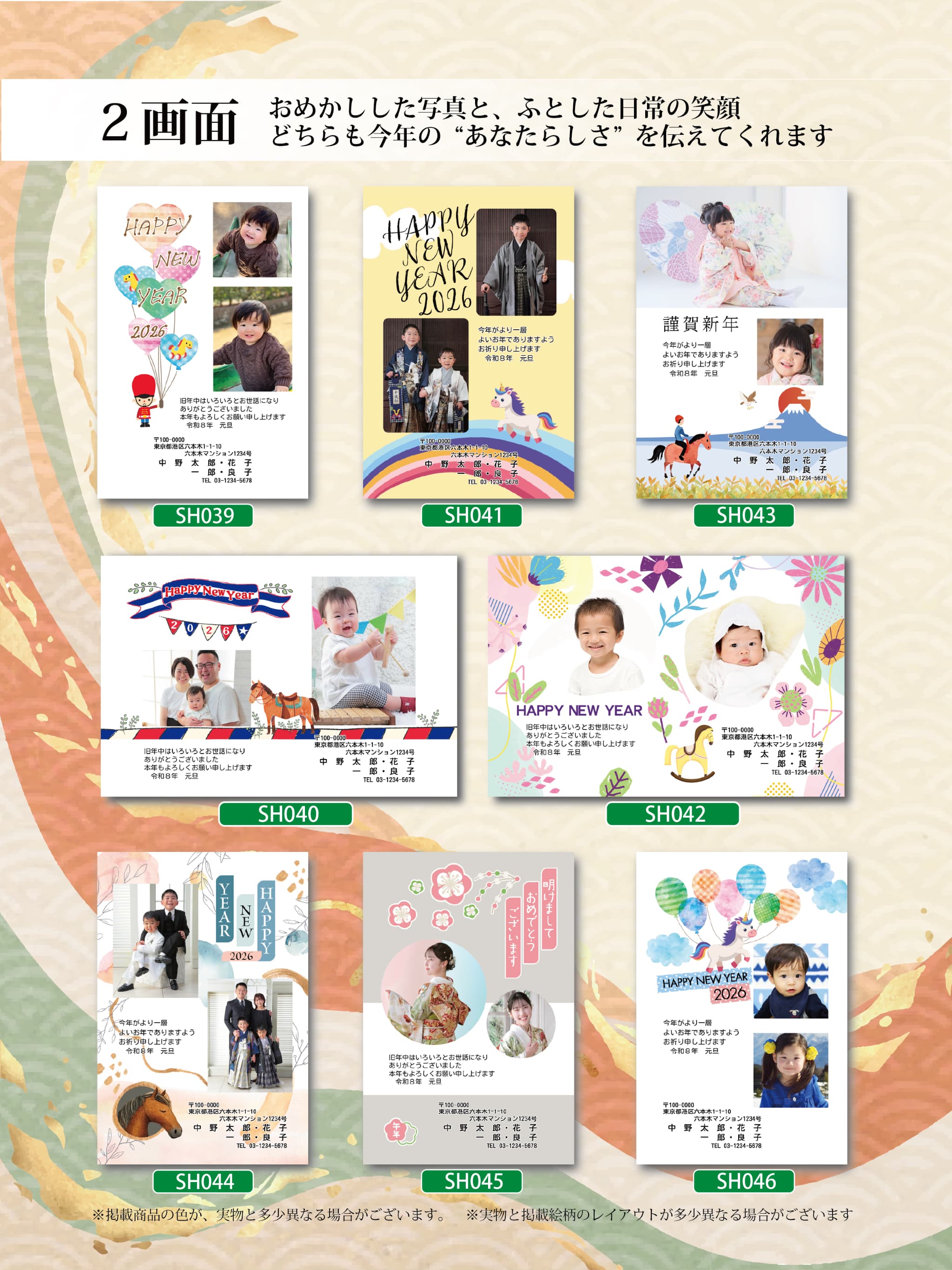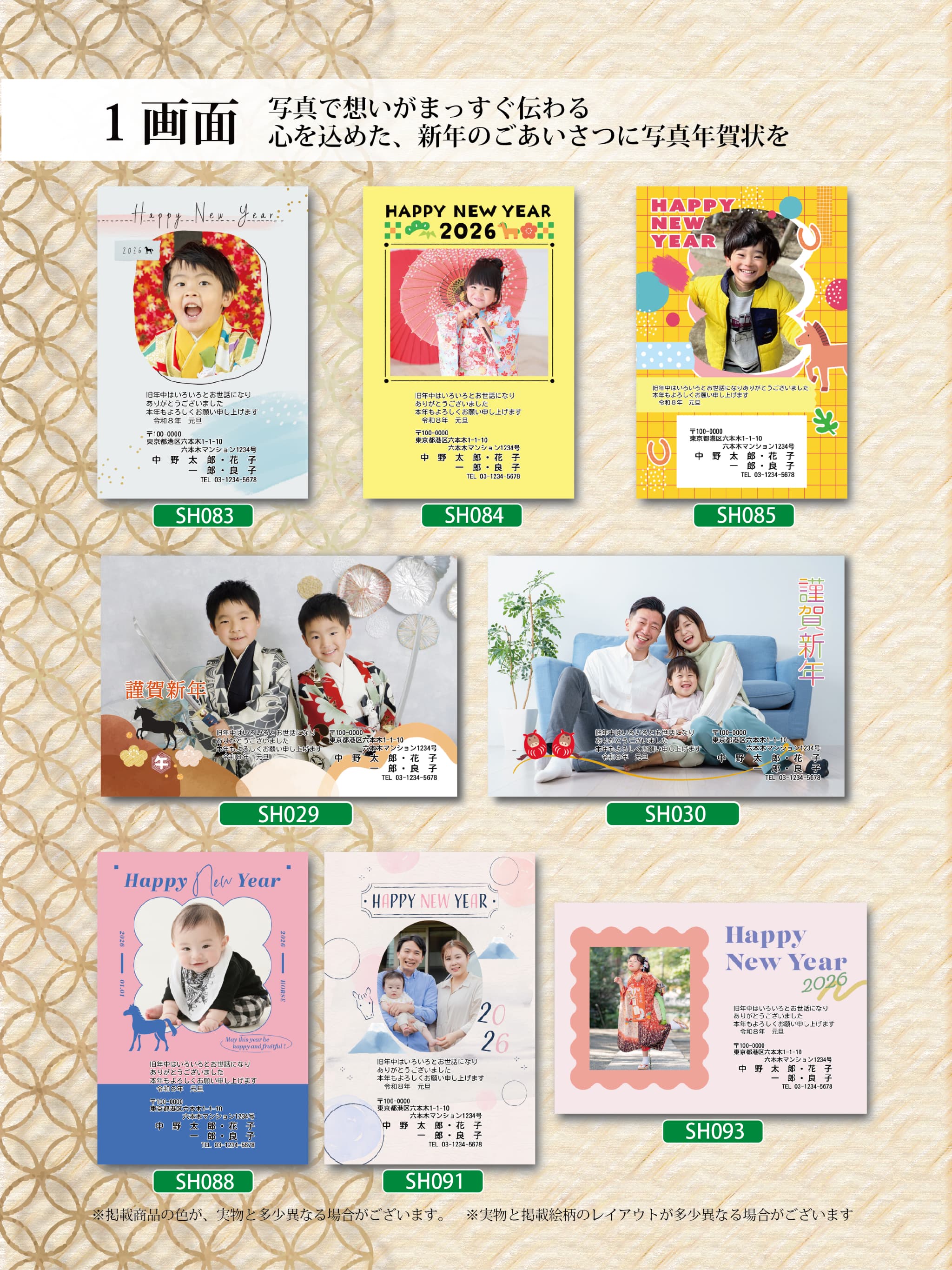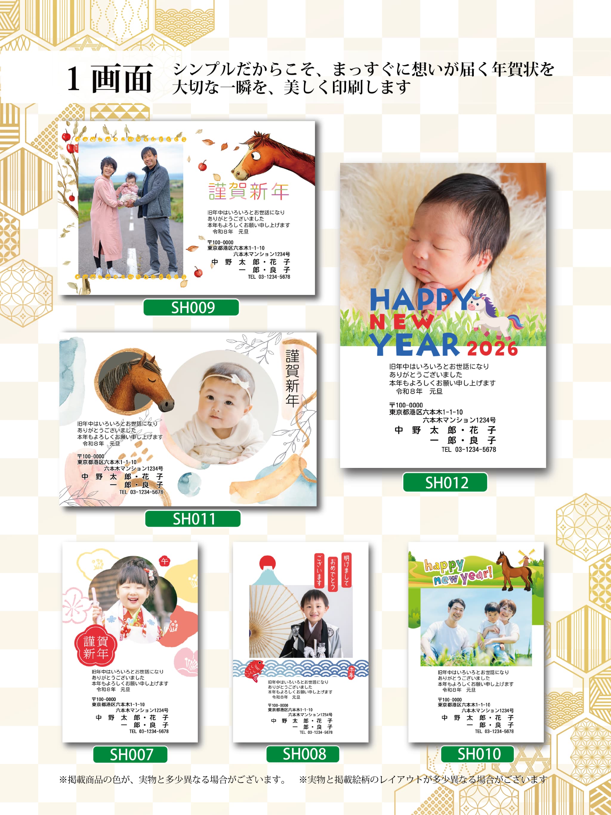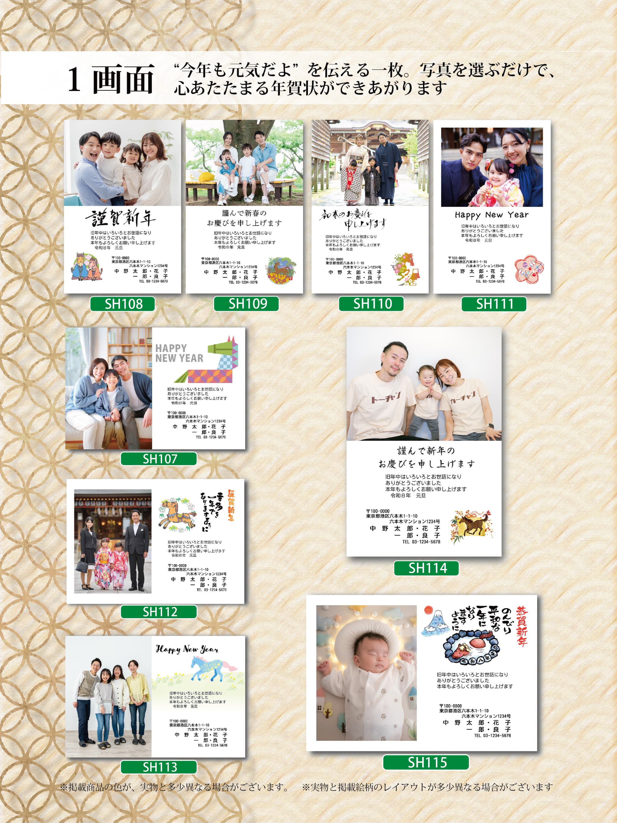 年賀状は1画面、2画面、多画面などから選べるので、お気に入りのデザインがすぐに見つかります!写真専門店として培った熟練の技術で、店舗でプリントした写真のように高画質、高品質な年賀状を作成いたします。