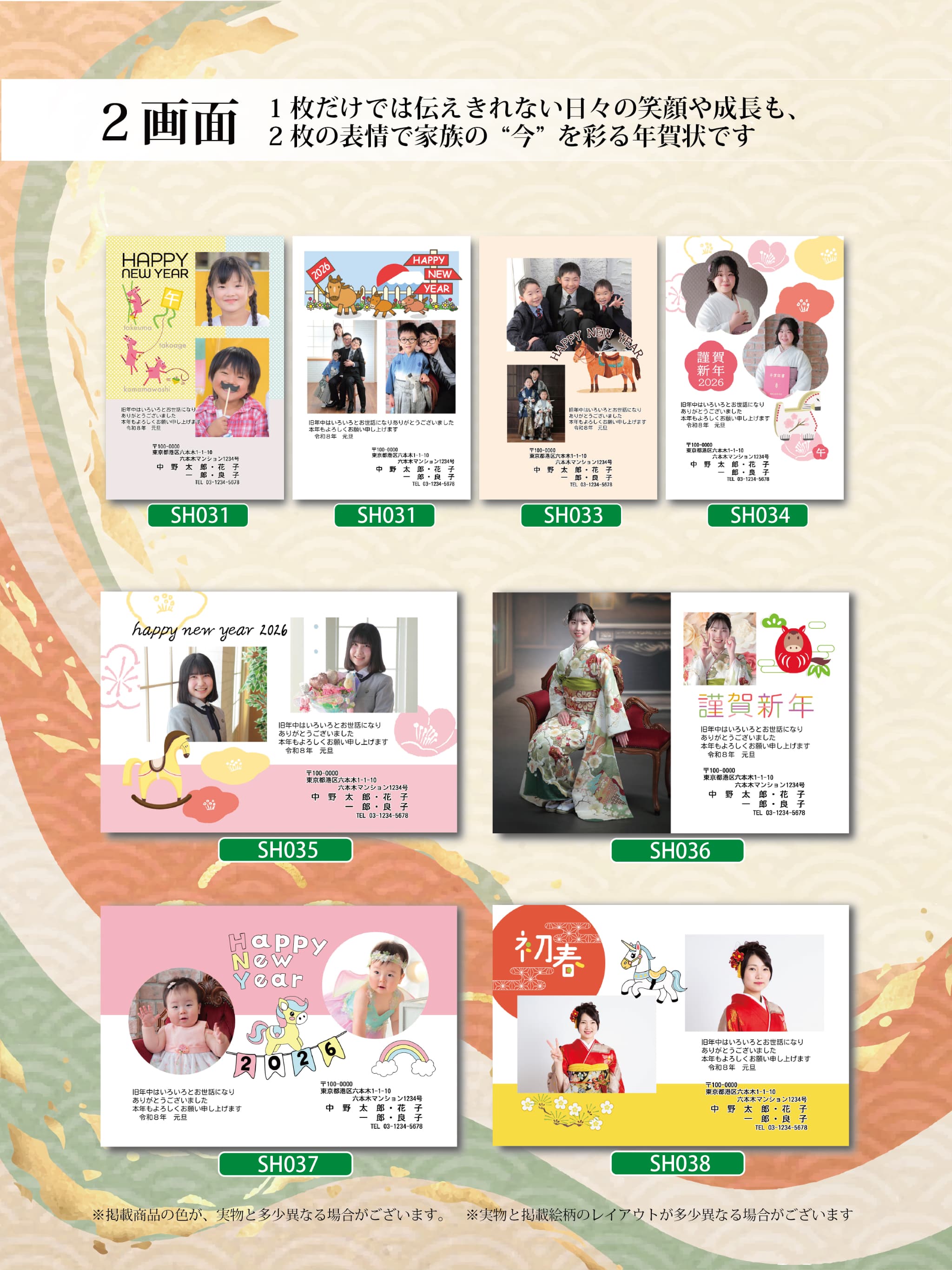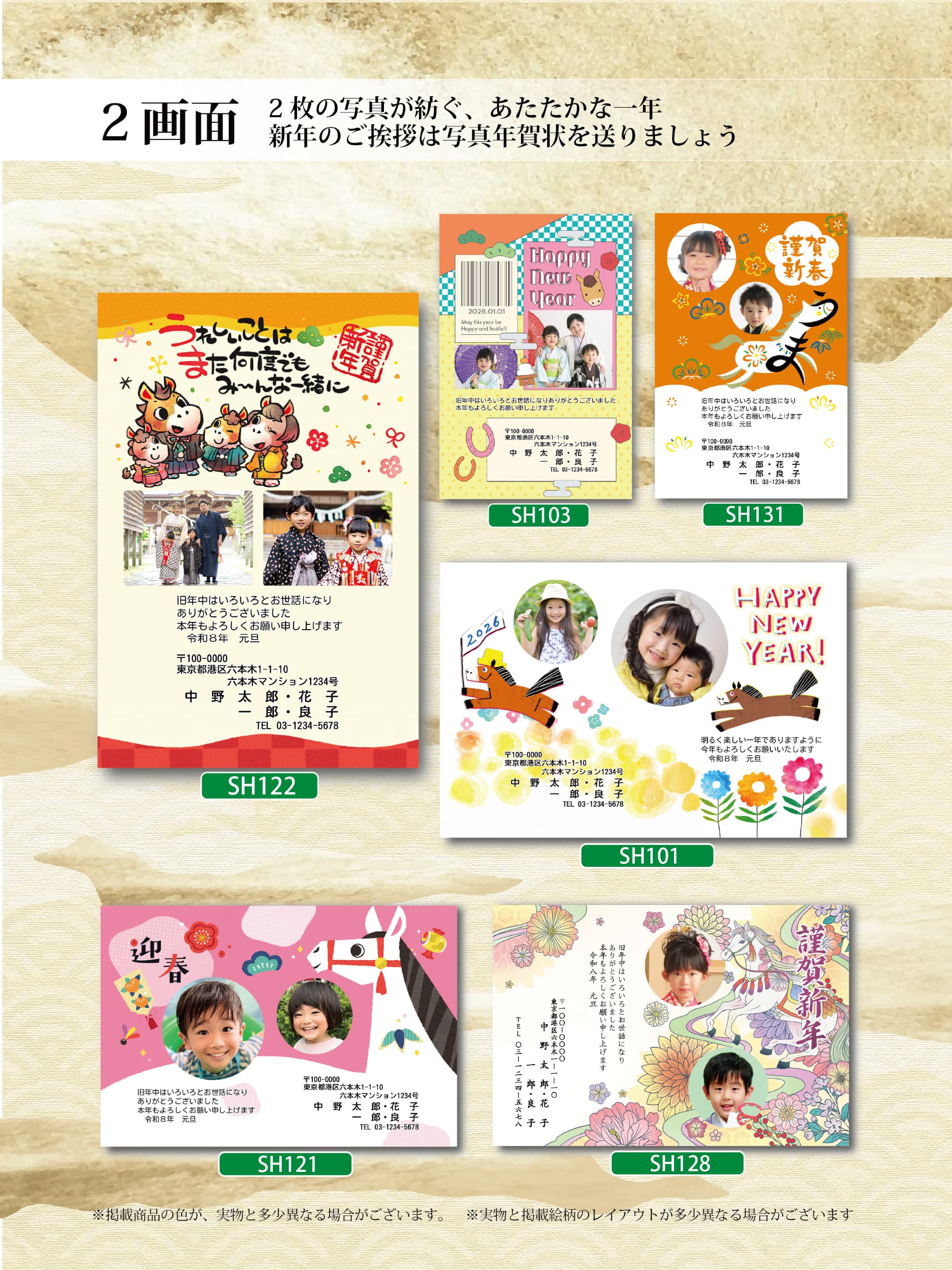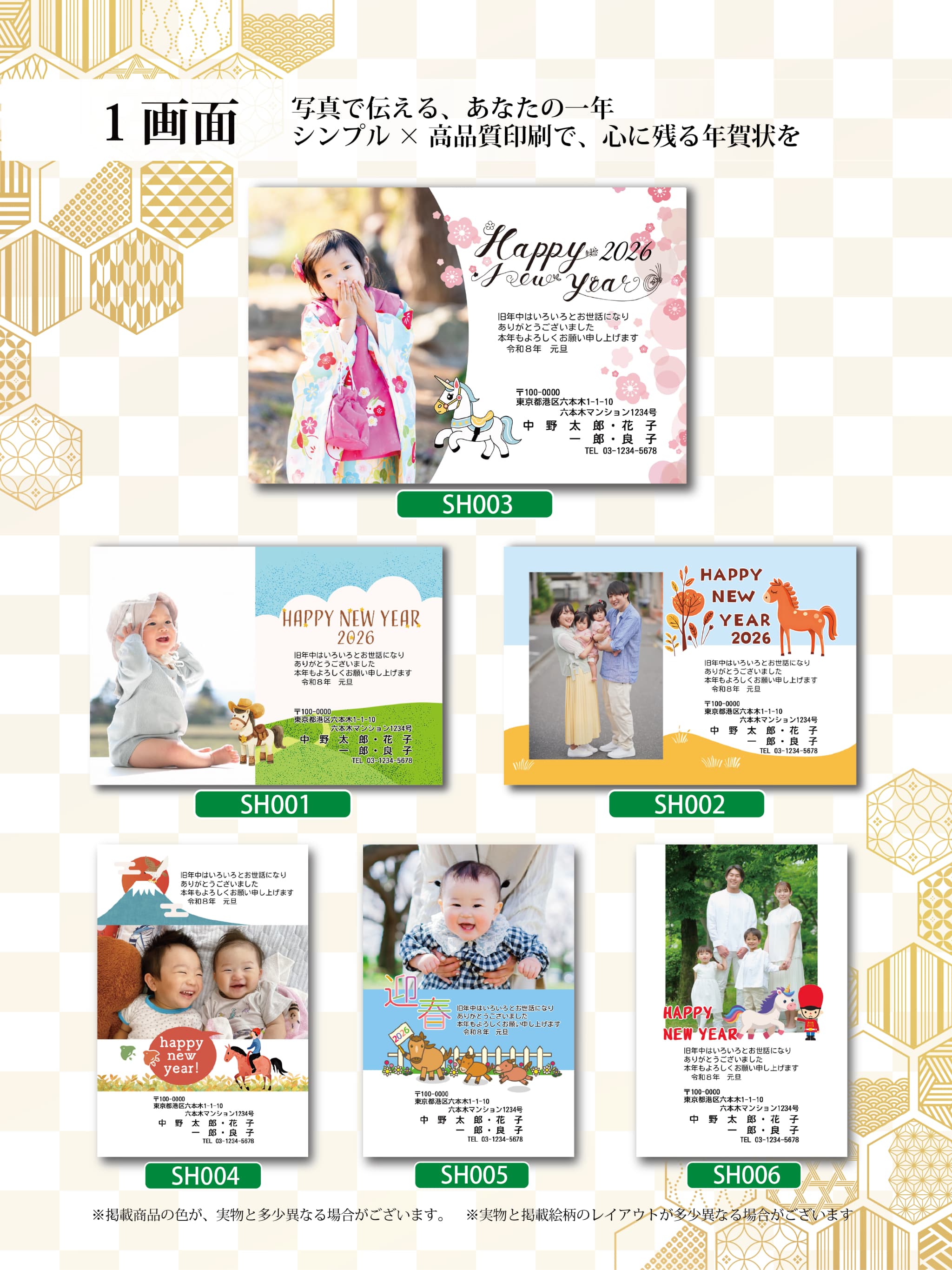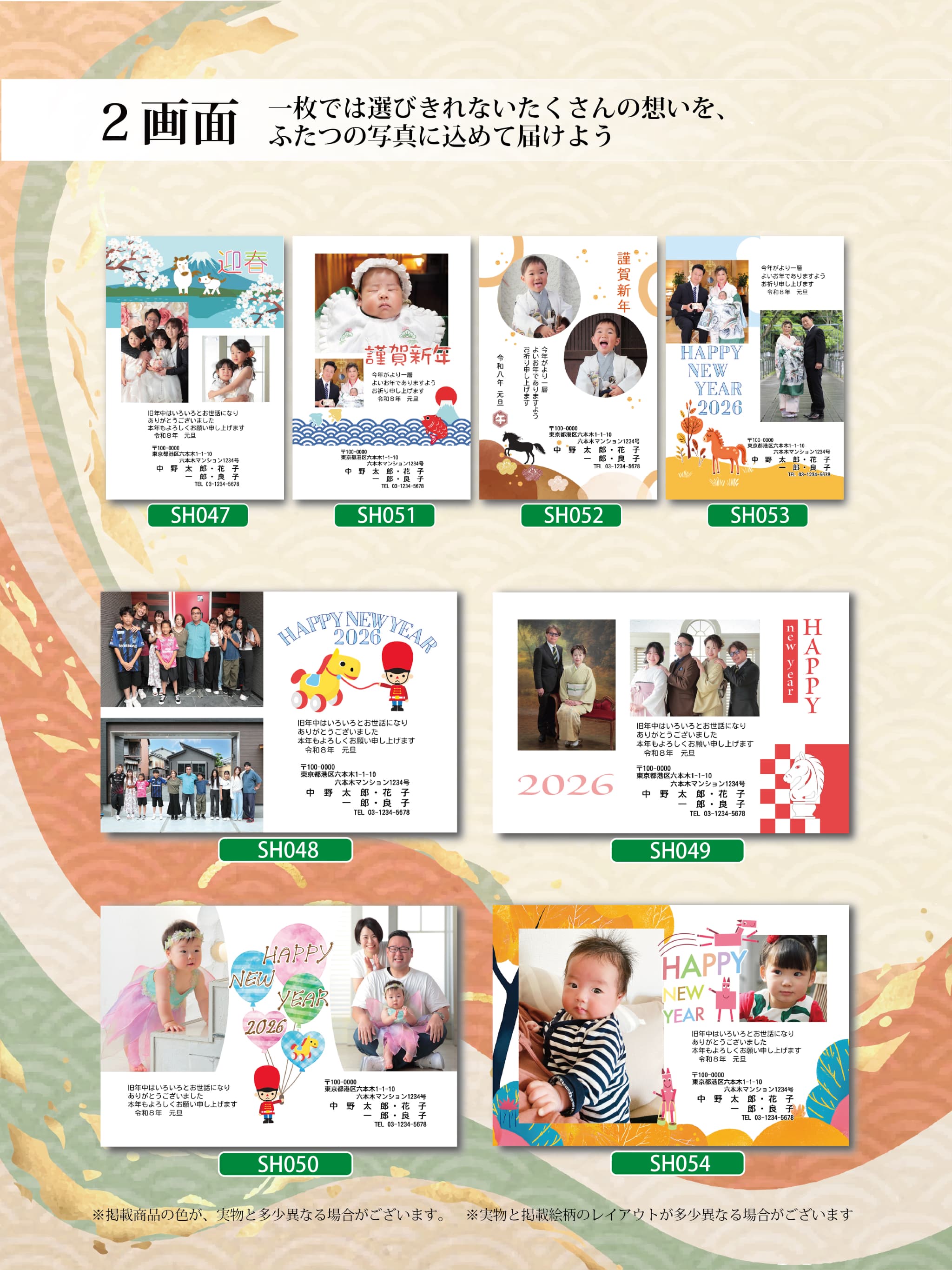 年賀状は1画面、2画面、多画面などから選べるので、お気に入りのデザインがすぐに見つかります!写真専門店として培った熟練の技術で、店舗でプリントした写真のように高画質、高品質な年賀状を作成いたします。